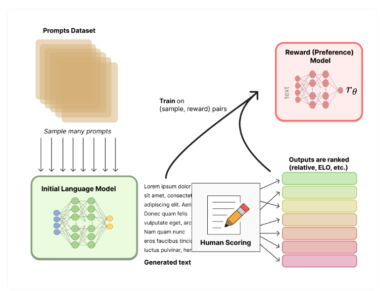 Generative AI의 일종인 ChatGPT는 '프롬프트'라는 Text기반 입력을 받아서 텍스트를 출력해 주는 구조다. 대부분의 AI가 그렇듯이, 좋은 output을 출력하도록 AI 모델을 학습시키는 과정이 필요한데, '좋은 output'의 경계가 모호하다는 문제점이 있다. 생성한 Text가 사람이 이해하기 쉬워서 좋은 점수를 줄 수 도 있지만, 잘못된 정보를 포함하고 있어서 오히려 나쁜 점수를 줘야 할 수도 있다. 창의성에 초점을 맞출 것인지, 사실성에 초점을 맞출 것인지 등 복잡한 요소들이 평가 요소에 포함될 수 있기 때문에, 다른 AI use case들과 비교했을 때, 다른 방식 (주관적인 요소를 반영한)의 loss function 설정과 학습 과정이 필요하다. ChatGPT에서는 이를 해결하기 위해, Reinforcement Learning from Human Feedback (RLHF)라는 방식으로 접근했다.