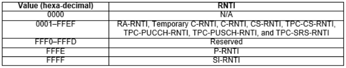 이처럼, MAC Layer에서 상황에 맞춰서 어떤 RNTI를 사용하라고 PHY Layer에 명령한다. 예를 들어서, SIB를 보내는 Sub-frame에서는 SI-RNTI를 사용하라고 PHY layer에 명령하는 방식이다. 그러면 PHY layer는 해당 TS 38.321의 Table 7.1에 있는 RNTI Value를 사용해서 Scrambling하여 데이터를 전송하게 된다. 여기서, RNTI를 위한 별도의 field가 있는 것이 아니라, RNTI와 보내려는 Bit가 하나로 Scrambling되어서 새로운 Bit열로 전환되게 된다. 아래 표는 RNTI가 가지고 있는 16 Bit짜리 고유값을 나타내기 떄문에, 자신이 필요한 RNTI가 있으면 해당 표를 참고해서 Scrambling에 이용하면 된다.