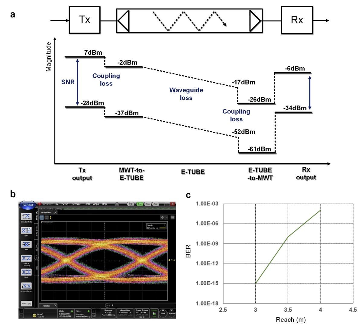 본 논문에서 설명하는 E-Tube의 핵심은 '우리가 보낼 (Tx) 신호를 RF (무선 주파수) IC가 70 GHz 위의 고대역에서 25 GHz 넓이의 광대역 신호를 E-Tube라는 Waveguide 통로에 흘려주고, Receiver (Rx)는 이를 받아서 Baseband 대역 (낮은 대역)으로 내려서 신호를 복원하면 주파수 대역폭 내에서 편차가 거의 없이 5db/m의 손실률과 4ns/m의 group delay 성능을 달성할 수 있다'는 것이다. 아래 그래프의 b를 보면, 구리선은 Baud rate (전송 측 속도)가 높아져도, 유선 손실률로 인해 수신 측이 이를 받아들이지 못해 일정 Data rate이상 올라가지 못하는 한계가 있지만, E-Tube와 Optics (광통신)은 유선 loss를 극복하여 수신 성능이 높아진다는 내용이다. 현재 데이터센터 向 케이블은 Optical (광) 기반 솔루션이 대부분이지만, 본 논문이 주장하는 것은 E-tube가 Optical 기반 솔루션보다 낮은 비용으로 적은 loss를 제공할 수 있다는 내용이다.