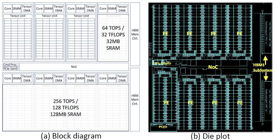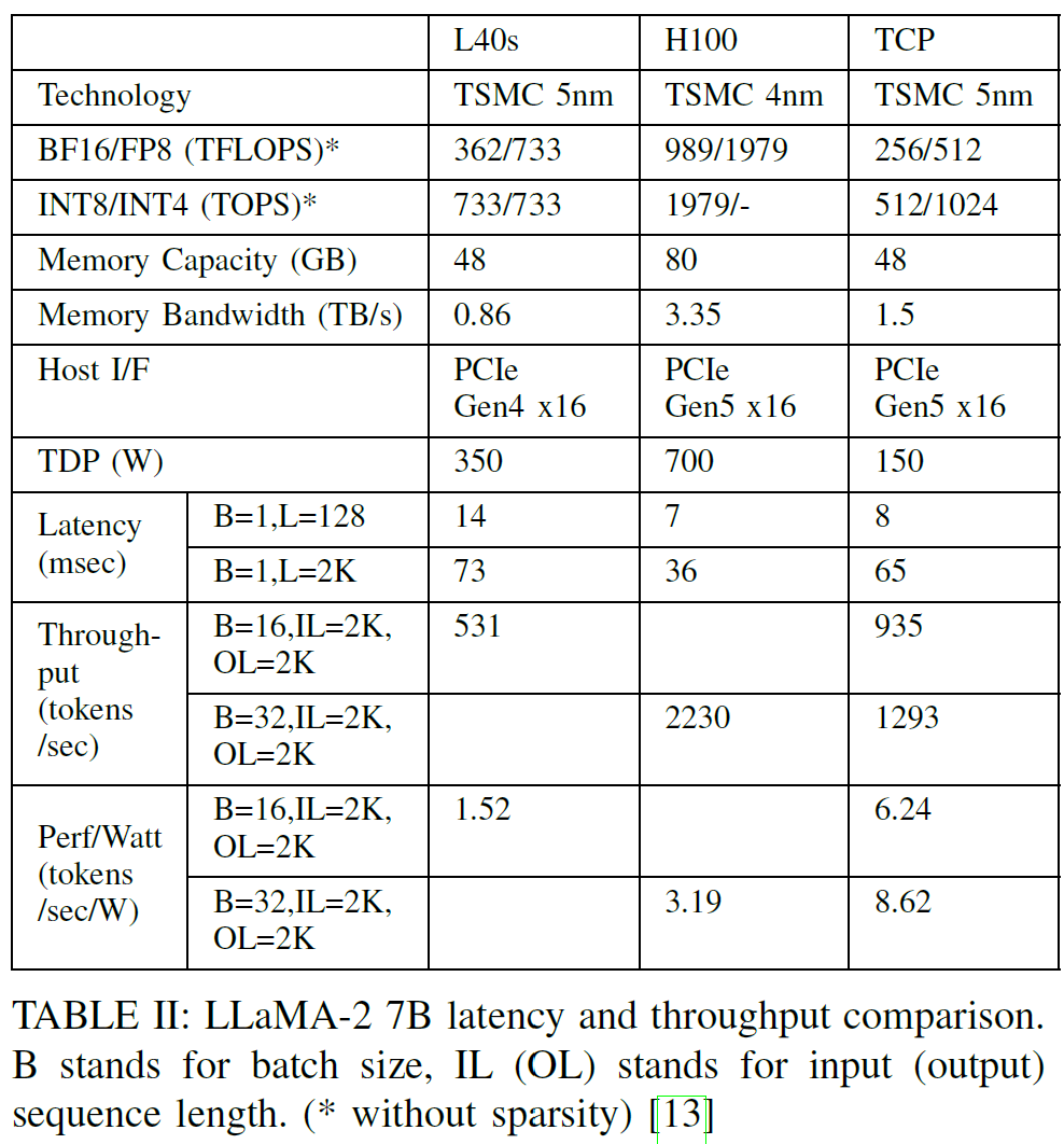 기본적인 Chip의 구조는 8개의 PE로 되어있으며, 각각의 PE는 독립적으로 연산할 수 있으며, 4개의 PE를 묶어 하나의 큰 Device로 구동될 수 있다. NoC가 PE간의 Contetion 없게 데이터 전송을 담당하고, LLM 같이 큰 모델을 Serving 해야 할 때는, 여러 TCP Chip과 연동되어 사용할 수 있고, PCIe Gen5와 P2P 통신을 지원한다.