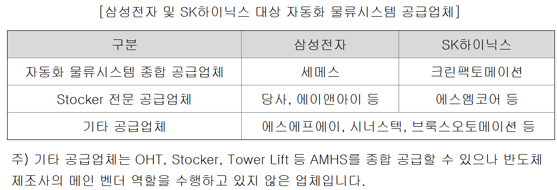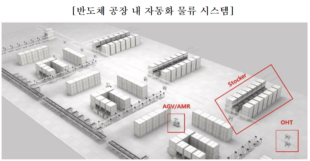 동사가 개발하고 있는 AMHS는 첨단 제조공정의 무인화를 위한 시스템으로, 동사는 '공정 내 반송물의 보관 및 반입·반출 역할을 수행하는 자동화 설비인 Stocker'와 '다양한 종류의 자재를 자동으로 이송하는 물류로봇인 AGV/AMR 솔루션'을 제공하고 있다. 동사에서 주력으로 개발하고 있는 반도체 공정용 Stocker는 반도체 웨이퍼가 담긴 FOUP(Front Opening Unified Pod)의 저장 및 반입/반출을 위한 스마트 자동창고다. 즉, Stocker는 공정 내 FOUP의 물동량을 파악하고 제어하여,공정 내 웨이퍼 관리를 효율적으로 하기 위한 무인 시스템이다. 동사는 증권신고서에서 '반도체 Stocker는 반도체 생산공정에 적합한 요구스펙이 엄격하게 적용되며, 반도체 제조사가 요구하는 Stocker 설계에 대한 기술적 진입장벽이 높게 형성되어 있다.'라고 설명한다. 하지만, FOUP이나 MES 등과 관련된 제품의 기술력에 대해서 자본시장이 조금은 박한 평가를 주는 것 같다.