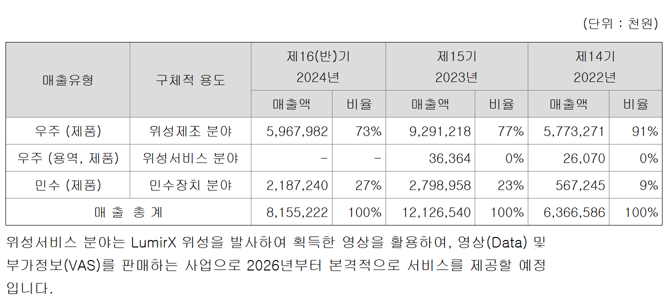 민간 위성 서비스 시장도 국내만으로는 너무 작은 시장이라는 생각이 든다. 미국이나 해외처럼 큰 영토를 보유하고 있는 국가들은 전국 단위로 생산되는 정보를 분석할 니즈가 있지만, 국내를 관찰하는 것에 위성까지 필요가 있을까라는 생각도 든다. 해외의 작황 정보를 보면서 선물시장에 이용하는 등의 금융에 사용할 수 있을 텐데, 이런 경쟁은 국내만이 아닌 해외 위성업체와의 경쟁도 불가피하고, 민간 시장 자체가 빠르게 성숙할 수 있을지 궁금하다. 국내 시장은 한계가 있다는 측면에서 해외 向 매출처를 확보하는 것이 중요해 보이고, 이를 위해 초소형 위성을 더 많이 띄워서 공간 해상도, 시간 해상도를 확보해야 하는데 ROI가 나오는 사업일지는 조금 더 검토가 필요해 보인다. 이런 이유로 동사가 위성서비스 관련 매출을 '26년 196억 원으로 대폭 상승한다고 증권신고서에 제시한 것이 조금 부담스러운 수치가 아닐까 조심스럽게 예상한다. 위성 서비스 매출이 계획대로 성장한다면 이익률 측면에서도 아주 긍정적일 것이라 생각하지만, 예상처럼 매출이 높아질 수 있을지가 관건인 것으로 보인다.