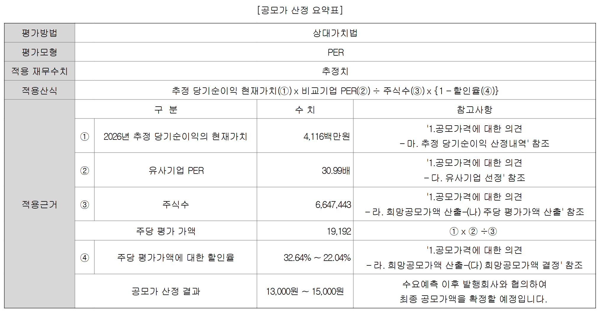 증권신고서에서는 '26년의 다음과 같은 실적을 기반으로 아래와 같은 Valuation을 제시했다. 기평 업체치고 과하게 부담스러운 Value는 아니지만 위에서 언급한 것처럼 동사만의 기술적인 차별성이나 빠른 매출 성장이 가능한 근거를 조금 더 정리해 주면 다음과 같은 Value가 조금 더 설득력 있게 보이지 않을까 싶다. 또한, PER x31배가 낮은 멀티플은 아니기 때문에, 동사의 매출 구성이 B2B 向인지, B2G 向인지, 매출 구성은 어떻게 되는지 조금 더 정리가 있었으면 좋았을 것 같다.