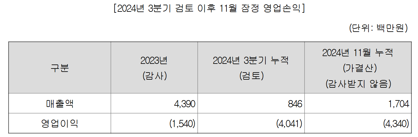 재무에 대한 부분을 조금 더 뜯어보자면, 자산 약 40억 정도에 약 10억 정도의 자본잠식이 나오는 것으로 보이는데, 보통주로 전환된 상태라는 것을 감안할 때, 현재 단계에서의 재무 건전성은 좋아 보이지는 않는다. '22년은 매출 38억에 영업손실 11억, '23년 매출 44억에 영업손실 15억 정도며, '24년 11월 가결산까지 매출은 약 17억 원이다.