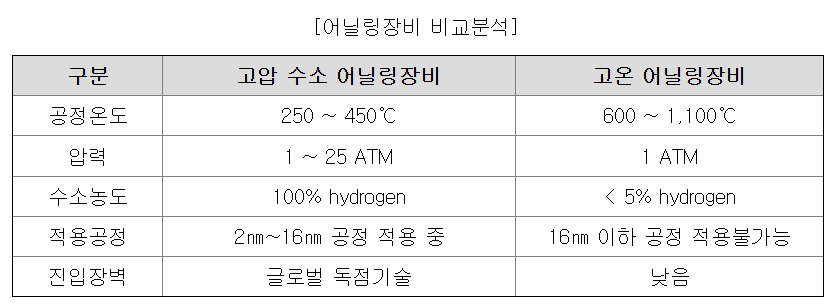 반도체 전공정 Process (출처: 동사 IR자료) 이와 비교하여, 동사에서 주력으로 개발하는 고압 수소 어닐링 장비는 450℃ 이하의 온도 환경에서 100% 수소농도를 유지하여 어닐링 효율을 극대화시킨다. 동사의 사업보고서에 따르면, 타사의 고온 어닐링 장비의 경우 600℃ 이상의 온도에서 어닐링이 진행되어 Metal Gate 및 금속배선에 변질을 유발하며, 공정미세화 어닐링에 미흡한 수소농도를 가지고 있다. 이와 비교하여, 동사의 장비는 기존의 문제점을 해결하고, 28㎚ 이하 공정을 기본으로 2㎚ 이하의 최선단 공정까지 적용시킬 수 있다. 고압 수소 어닐링 장비는 1 기압~25 기압까지 고압가스를 사용하므로, 이를 안정적으로 운용하기 위해서는, 고압 용기에 대한 운영 노하우 및 고압에 대한 인증이 필요하다. 동사가 2022년 발표한 IR자료를 보면, 동사의 장비를 사용하면 반도체 트랜지스터 구동전류 및 집적회로 성능이 약 10~15% 증가하는 효과가 있다고 밝혔다.