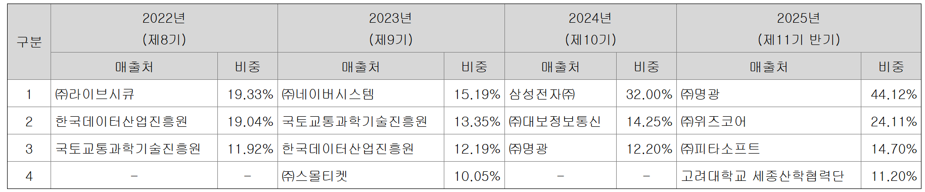 이런 최적화가 모두 자동화되고 경량화/정확도 등의 성능이 잘 나온다면, AI 모델을 개발하는 사람 입장에서는 경량화를 고려하지 않고, 정확도가 잘 나오는 모델을 개발하고, 노타의 솔루션에 넣고 돌리면 될 것이다. 하지만, 큰 틀의 자동화는 가능하겠지만, HW (칩)에 따라 모델 최적화 등 일련의 과정에 대한 자동화가 얼마나 가능한지나 최적화로 올릴 수 있는 성능 (e.g., 정확도를 유지하면서 올릴 수 있는 추론 속도)의 룸이 얼마나 남아있는지는 다를 수밖에 없다는 것이 개인적인 생각이다. 따라서, 어떤 HW에서 어떤 모델을 돌릴지 등에 따라 튜닝이 필요할 것 같다. 아래의 증권신고서의 자료를 보면, Solution과 Platform이 용역매출로 잡혀있는데, '고객사의 솔루션 적용 과정에서 동사의 인원이 많이 필요한가'라는 생각이 든다. 동사의 인원이 많이 필요하다면, 100% SaaS처럼 사용하기 위해서는 추가 개발이 필요할 것 같다. 주요 매출처는 다음과 같으며, 매출처 다변화가 되어 있는 것으로 보인다.