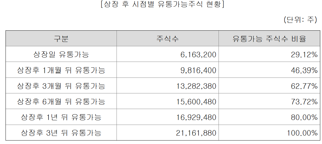 VC 투자를 상당히 많이 받았기 때문에, 오버행에 대한 생각을 안 할 수가 없다. 증권신고서를 보면, 2년 이전에 투자한 VC들은 노락업, 1달, 3달 보호예수를 1/3씩 묶은 것으로 보이고, 네이버 등의 SI들은 6개월 보호예수를 묶은 것으로 보인다. 상장 후 시점별 유통 가능 물량은 다음과 같다.