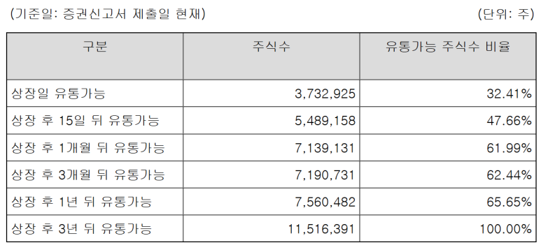 상장일의 유통가능 주식수 비율이 약 32.4%라는 것을 고려하면, 상장일 락업 물량은 적절한 것으로 보인다. 단, 일반적인 기업들과 다르게, 약 15일 락업 물량이 별도로 있고, 이 물량이 상당히 많이 풀리는데, 1개월 이후 유통가능 물량도 많이 풀리기 때문에, 상장 초반의 전체적인 오버행은 꽤 많지 않을까라고 조심스럽게 예상해 본다. 이런 점이 상장일 투심에 반영될 경우, 상장일 주가 부진이 있을 수도 있다.