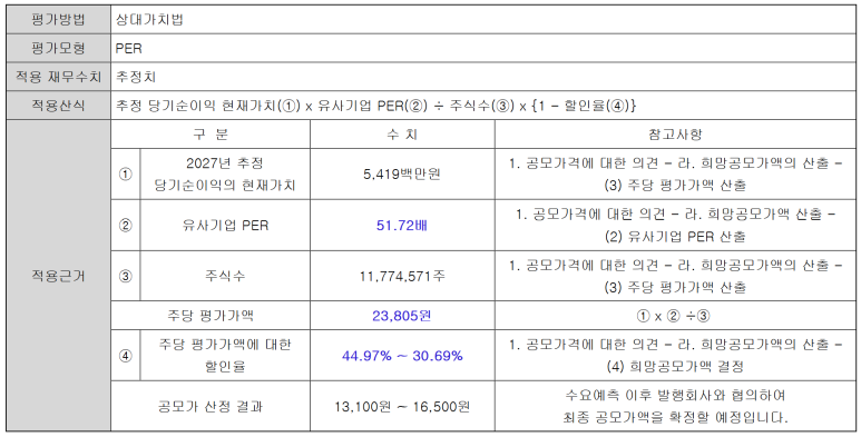 동사는 다음과 같은 Valuation을 제시했다. 전체적으로 보면, '27년 추정순이익을 끌어오는 방식으로 Valuation을 했다. 적용 PER는 51.72배를 적용하였고, '27년 당기순이익은 약 54억 원을 추정했다.