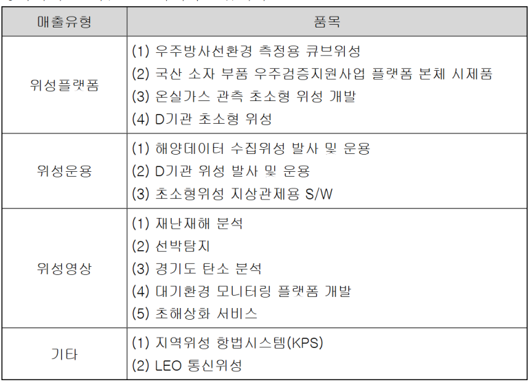- 상용 초소형 위성 사업에서는 저궤도 초소형 위성 플랫폼 개발을 중심으로 사업을 영위하고 있으며, 한국항공우주연구원, 한국천문연구원 등 우주산업 분야의 정부 연구기관과 군 관련 기관, 대기업 등을 주요 고객사로 확보하고 있다. 큐브 위성 제작이 가장 중요한 사업이고, 국산 소자부품 우주검증 지원사업 플랫폼 본체 시제품 제작도 하고 있다.