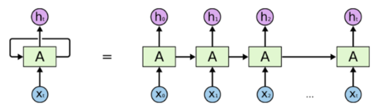 RNN은 이름에 '순환'이라는 Recurrent가 들어감에서 알 수 있듯이, 한 쪽 방향으로 정보가 흘러가는 것이 아니라, Layer에서 순환하는 구조를 갖고 있다. 이는 그림을 통해서 조금 더 알기 쉽게 설명할 수 있다. 이를 위해 다른 Blog [1]에 잘 설명되어 있는 그림을 가져왔다.