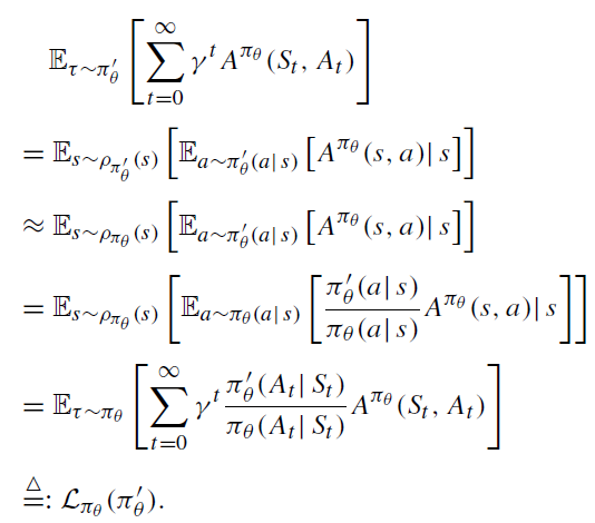 Parameter Update TRPO는 Step-Size에 따라서 불안정적으로 Training이 되는 것에 대한 해결을 제시한다. 요약하자면, 'New policy를 Improved performance로 update한다고 믿을 수 있는 지역 (Trust Region)에서만 update하자'는 주장이다. 즉, Policy Update가 향상시킬 수 있다고 보장은 할 수 없지만, 적어도 '악화는 시키지 않도록 하자'는 내용이다. Old Policy에서 Updated Policy로 바뀌면서의 Improvement를 Advantage Function이라고 한다. (Kakade and Langford 2002). 그런데, 이 수식을 한번에 New Policy에 대해서 update하는 것이 수식적으로 까다롭기 때문에,