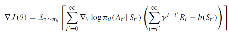 위와 같이, Episode 후반부에 나오는 Variance를 줄이기 위해, 후반부에 Discount factor를 곱하기도 하고, Early state의 Variance를 줄이기 위해 앞에 곱하기도 한다. 또는, Action이 아닌, state에만 영향을 받는 'baseline'을 Reward term에서 빼서, 전체 Variance를 줄이기도 한다. 이런 Baseline을 어떻게 설정하는 것이 좋을지에 대한 논문도 2017년부터 많이 Propose되고 있다. 주로, V(S)같이 State Value Function을 잡는 경우가 많다.