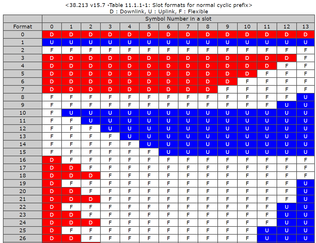Slot Format의 예 Slot Format의 14개 symbol에 들어갈 수 있는 경우의 수는 각각 D/U/F가 있는데, Flexible (F)는 D나 U 어떤 것을 보내도 상관이 없다는 뜻이라고 거의 99%의 문서에 설명되어 있다. 이 글만 봐서는 F가 D나 U 어떤 것이든 가능하다고 하면 전부 F로 보내는것이 가장 좋은것 아닌가? 라는 생각을 가졌다. 하지만, 표준 문서와 여러 사이트를 찾아본 결과, Slot Format을 정하는 우선순위 때문에 D/U/F가 나눠진 것이구나 라는 생각을 했다.