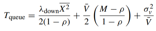 System Modeling의 기본 개념은 이전 [1]논문과 비슷하다. 5G URLLC HARQ and Resource Allocation (논문 리뷰) 에 언급된 것처럼, Channel Use라는 개념을 넣어서, Information Bit를 보내기 위해 필요한 Transmission delay와 Bandwidth를 나타낸다. Feedback delay는 [1]논문과 같이 Constant라고 고정했다. 여기까지는 큰 변화가 없지만, 이 논문에서는 Transmission delay를 이용해서 Queuing Delay를 계산한다. 이를 위해, Pollaczek–Khinchine formula (P-K Formula)를 이용한다. P-K Formula는 M/G/1 Queuing System에서 Service Time의 정확한 분포를 몰라도, Service Time의 1차 모멘텀 (평균)과 2차 모멘텀을 알고 있으면, Queing delay를 계산할 수 있는 식이다. 저자는 지금 바로 전송 가능한 Bandwidth가 없어도 Queuing delay를 포함한 전체 Delay만 1ms보다 작으면 된다고 말한다. 즉, URLLC의 Reliability Requirement를 만족하기 위해, Bandwidth를 추가로 할당받아 놓을 필요가 없다는 얘기다.