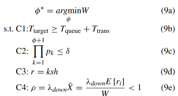 System Modeling 이렇게 P-K Formula를 적용해서 Queuing의 식을 세우면서 Vacation에 대한 설명도 추가한다. Downlink 데이터를 보내는데, 1 Slot(=14 Symbols)에서 Uplink를 보내는 시간을 Server가 Idle해지는 시간 Vacation으로 지정했다. 이렇게 시스템을 설계했지만, [1] 논문과의 성능비교를 위해서, Perfomance Evaluation 부분에서는 Vacation을 무시했다. 이후에 Queuing Delay까지 포함한 전체 Delay가 Delay Constraint보다 작다는 것과 p^m이 전체 Reliability Constraint보다 작다는 것으로 식을 세웠다. 이를 만족하기 위한 식을 2차 부등식 형태로 정리하여, 최소의 W값을 이 System의 Solution으로 세웠다.