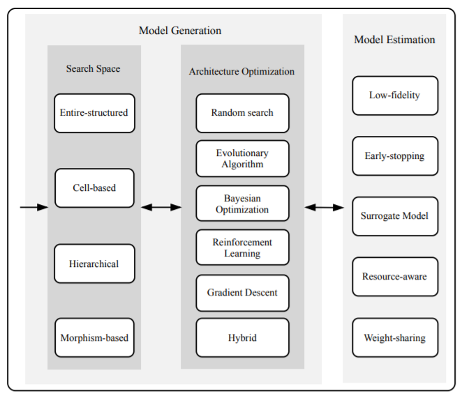 Introduction에 소개되어 있는 AutoML이 필요한 이유는 위에서 대략 설명했다. 모든 Architecture와 Hyper-Parameter 조합을 확인해보면 좋겠지만 천문학적인 수의 조합이 가능하기 때문에, 이를 효율적인 방법으로 찾아보자는 Motivation이다. 이 논문에서는 ML을 적용하는 Pipeline인 Pre-Proecessing / Model-Generation / Model Evaluation 순서로 설명한다. 그 중에 Model-Genration에 초점을 맞추면, Search-Space / Optimization Method로 나눠질 수 있다. Search-Space는 기존 ML을 사용할지, NN 모델을 사용할지고, Optimization Method는 Hyper-Parameter를 최적화할지, Architecture를 최적화할지로 나뉜다. 뒤에서 조금 자세히 다룰 Network Architecture Search (NAS)는 NN 모델의 Architecutre를 최적화 하는 방법이다.