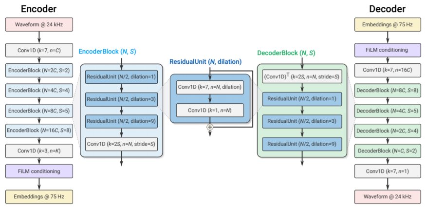 Soundstream의 NN 구조도 Soundstream의 전체적인 NN 구조도는 파악을 해봤으니, 이를 구성하는 AutoEncoder의 구조를 볼 차례다. 꽤 길게 그림이 그려져 있지만, 결국은 Convolution Nueral Network (CNN)구조로 이루어져있음을 알 수 있다. 또한, 가로, 세로가 있는 이미지 데이터인 2D data와는 달리 시간축에 따른 신호의 세기인 1D Data를 다루기 때문에, 1D-Convolution을 썼음을 알 수 있다. 또한, 이 논문에서 강조했던 Real-Time을 위해 Causal Convolution을 썼다고 얘기한다. 신호 및 시스템 시간에 나오는 Causal의 의미는 쉽게 말하면 '과거의 정보만을 Input으로 받아들이는 시스템'이다. 지금 바로 Inference를 해야하는데, 미래의 Signal을 받아들이는 것은 infeasible 하기 때문에, Causal Conv.를 많이 사용한다.(e.g., Wavenet) ResidualUnit은 CNN의 Residual Network에서 볼 수 있는것처럼 bypass를 사용하는 구조다.